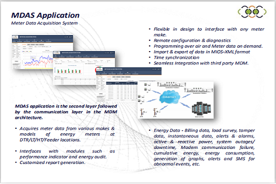 Meter Data Acquisition System (MDAS) is a centralised data management system that controls and enables management of GPRS modems that gather energy data in real time. It acquired meter data from various models/ makes of energy meters at DTR, LT, HT and feeder locations.